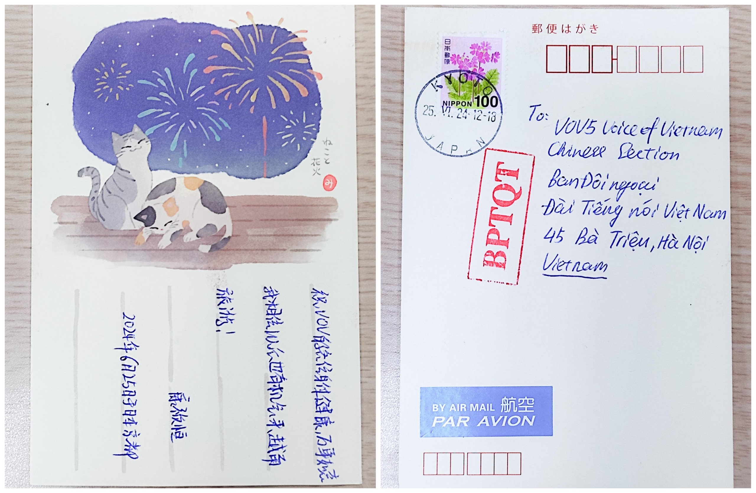 接下来希望和大家分享的是一位香港听众 CHIU WAI YIN 寄来的明信片。他在明信片上写道:“我是一名来自中国的旅行爱好者,近期访问了贵国,对越南的美丽风景和丰富文化遗产留下了深刻印象。越南历史悠久、文化独特,河内、下龙湾、顺化皇城等每一处都充满了迷人的魅力和深厚的文化底蕴。”