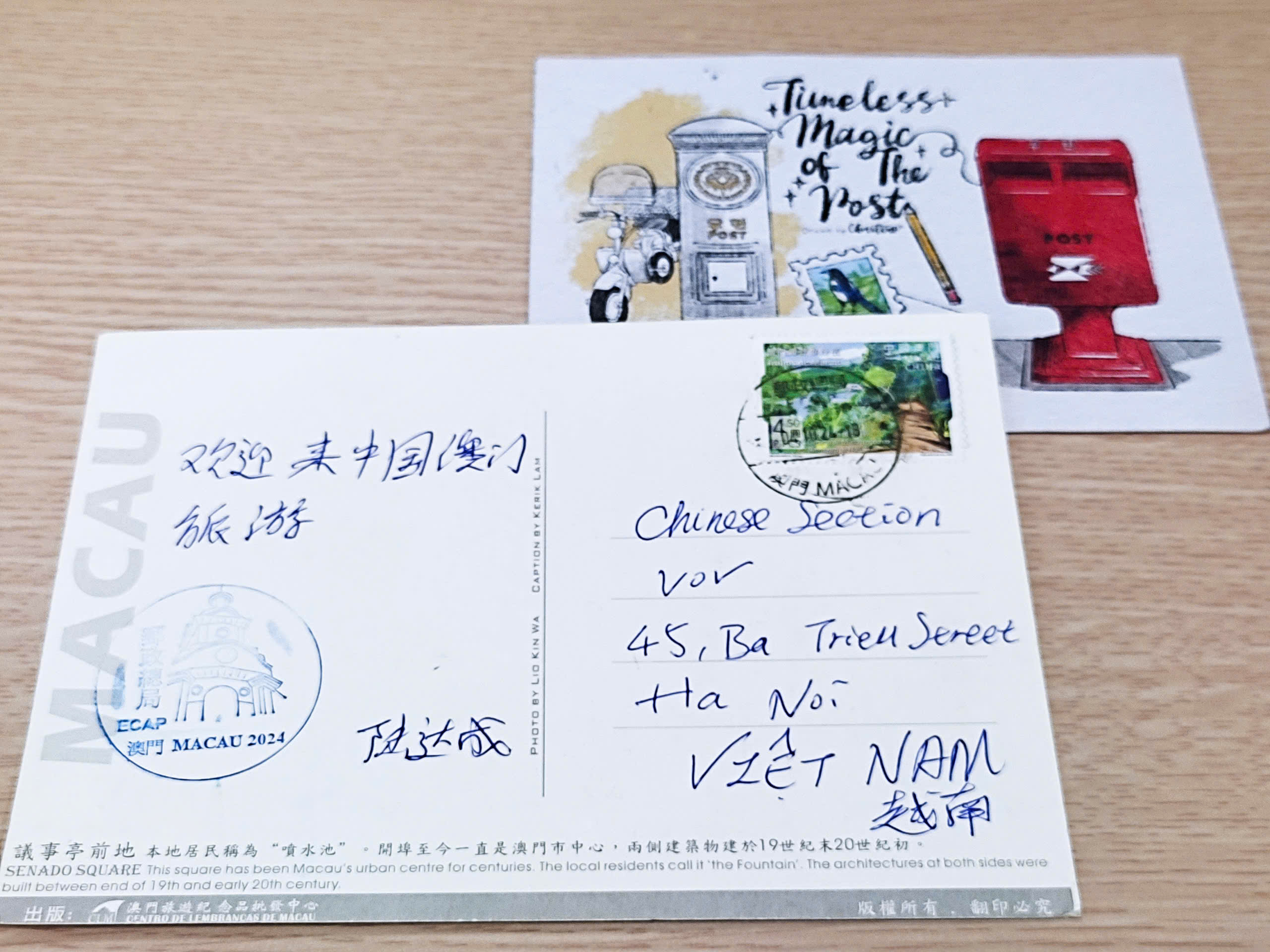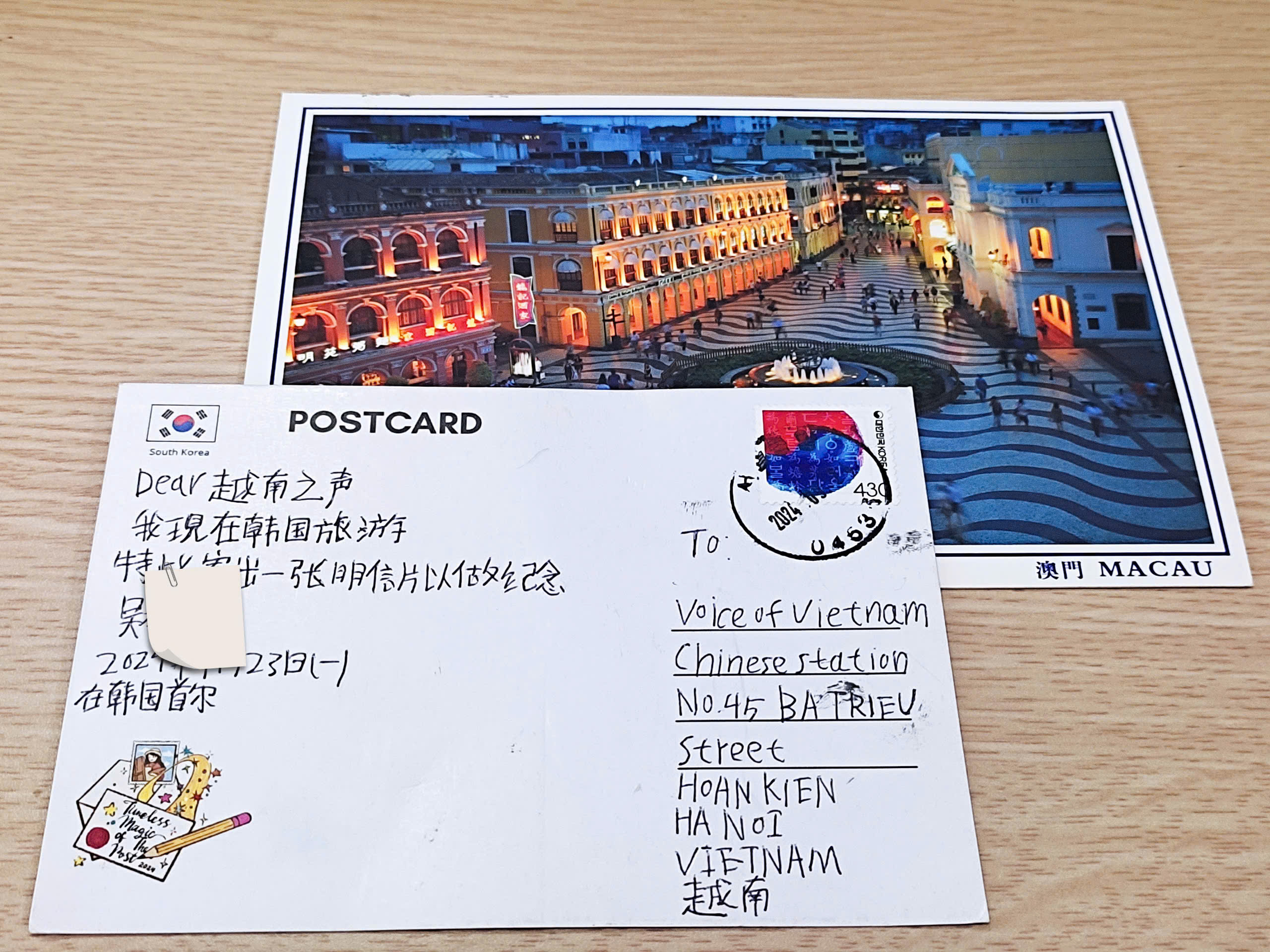 我们继续分享其他信件。广东省一位姓吴的听众最近寄给我们一张明信片。说是他去韩国旅游时,惦记我台,所以从首尔给我们寄出明信片作纪念。另一位听众,浙江省的陆达成也寄来一张明信片,是他去澳门时寄出的。