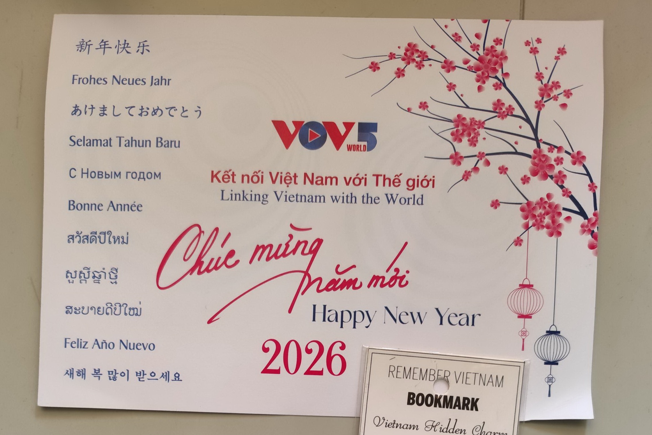 广东省听众张培强发来短信说,今年他提前回老家过年,因为要参加亲戚的婚礼。不过,很幸运,还来得及收到我们的新年贺卡。是的,今年,我们对外部订制了一批新年贺卡。卡片上印有中部地区会安古街美景,还有13种语言的新年贺词。我们于1月给各地朋友寄出,希望大家都将顺利收到并告诉我们。实际上,春节前很多朋友都说已经收到了。