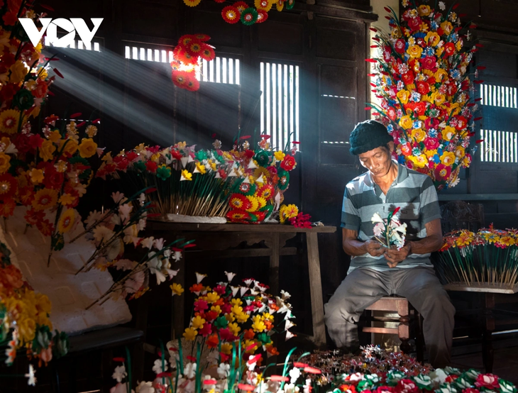 艺人阮化家就是其中一个。阮化先生的儿子阿孝说,如今,纸花不再仅仅用于祭祀活动或场所了,而且更受顾客青睐,用来装饰住宅庭院、商店等等。因此,纸花制作业有了更多的发展机会,不光传统春节,而且全年都在生产。