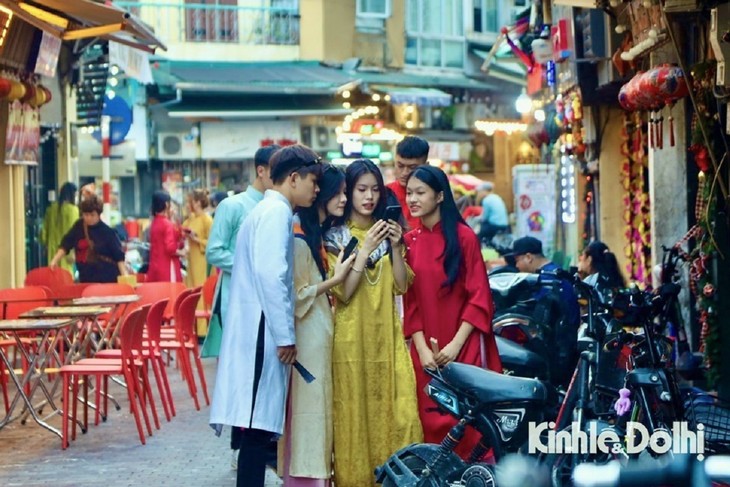 春节气息已经弥漫河内大街小巷。还剑郡谢现街(Tạ Hiện)是最受年轻人喜欢的古街之一。图片来源:《kinhtedothi.vn》。