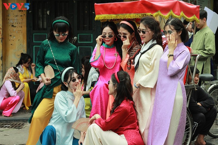 每到春天,身穿奥黛,在街头漫步或留影,秀出温柔妩媚的姑娘,在河内并不少见。