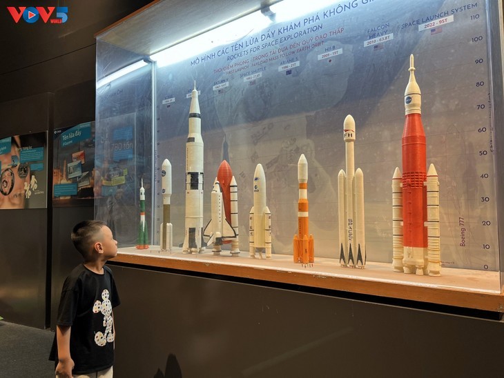 一个小朋友看太空火箭模型看得入迷。 |