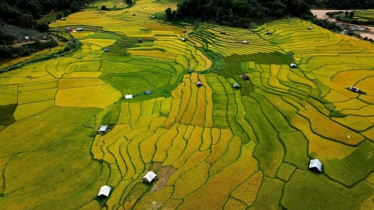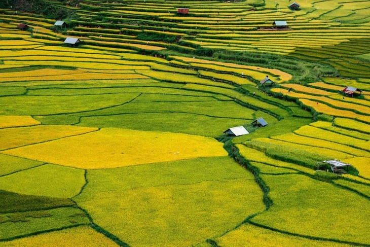 这里的梯田层层叠叠。块块大小不一,颜色深浅不同。它们一块夹着一块,颜色逐渐变化。图片来源:《西贡营销报》,摄影:多多。 |