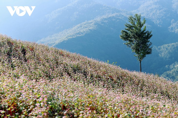 在广阔的山林中,紫色、粉红色的荞麦花覆盖了整个山谷和山坡,宣告河江旅游季的到来,这是一年中最好的季节。 |