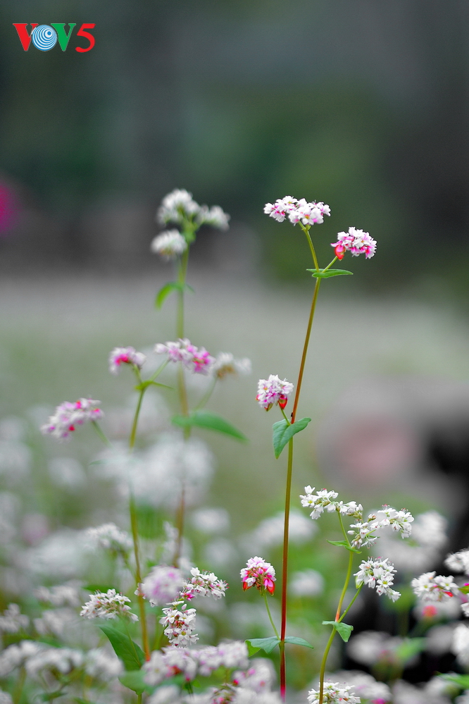 荞麦花有白、粉红两色。成熟后,麦杆变成黄红色,花瓣渐渐掉落,出现三角形的黑粒,这个特点可能就是荞麦花越南语名称的来源。 |
