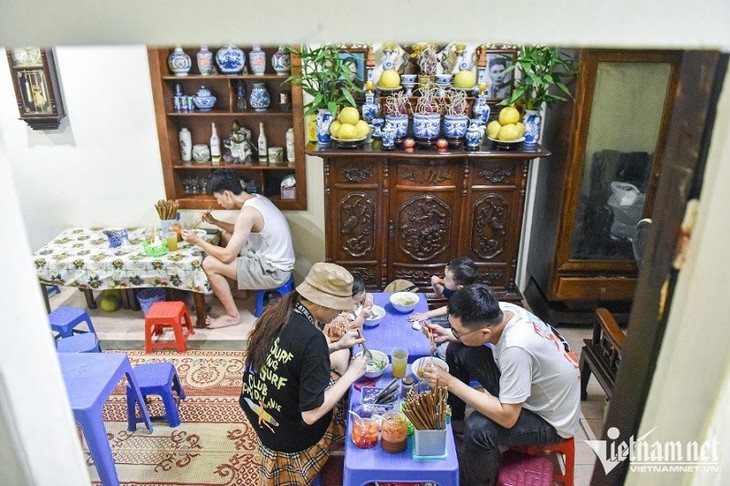 餐厅设在摆着祭台的客厅里。食客在享用河粉时也可以看到河内古街区人家的生活空间。图片来源:vietnamnet.vn。 |