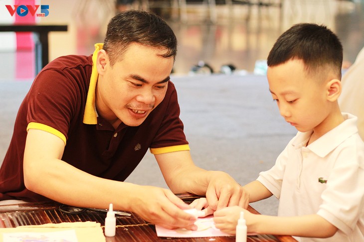 河内市河东郡残疾人协会会长、“碎片艺术”合作社经理黎越强(右)表示:“这是我们为合作社残疾人举行的第一个规模较大的美术展。我们希望观众前来参观、购买作品,不只是出于对残疾人的同情,更是因为欣赏他们的创造力。”