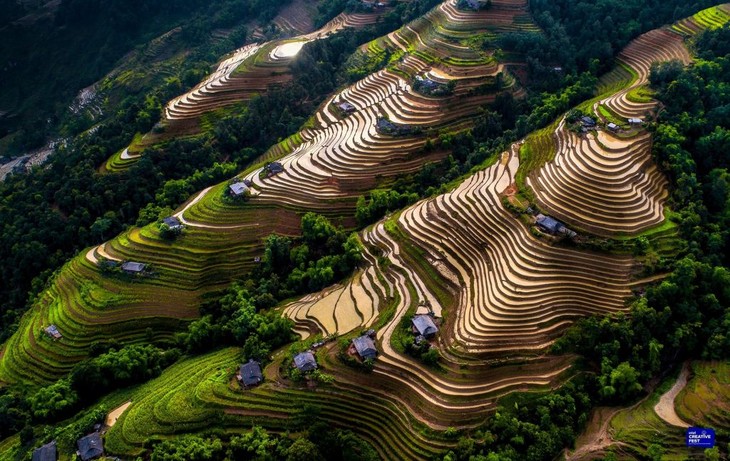 从高空俯瞰木江界梯田,弯弯的梯田犹如粼粼波光。图片来源:越南之声,摄影:阿卢。 |