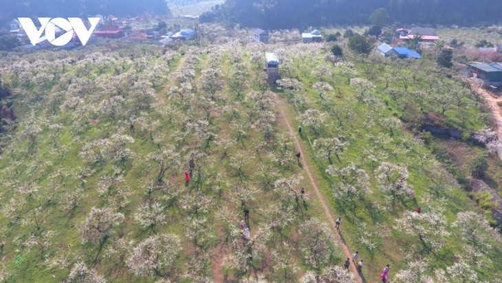 (VOVWORLD) - 这个季节,如果有机会来到木州高原,游客会仿佛进入了仙境,这是一个山谷、山坡被盛开的李花染成了白色的仙境。