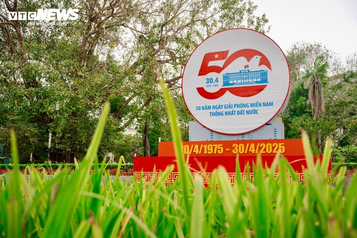 4月下旬,欢庆南方解放、国家统一50周年的气氛弥漫在河内街道上。在奠边府、长诗、金马、郎下、大瞿越等主干道,两旁都悬挂着一排排金星红旗,其间是宣传爱国精神、民族自豪感的标语、海报、宣传画。