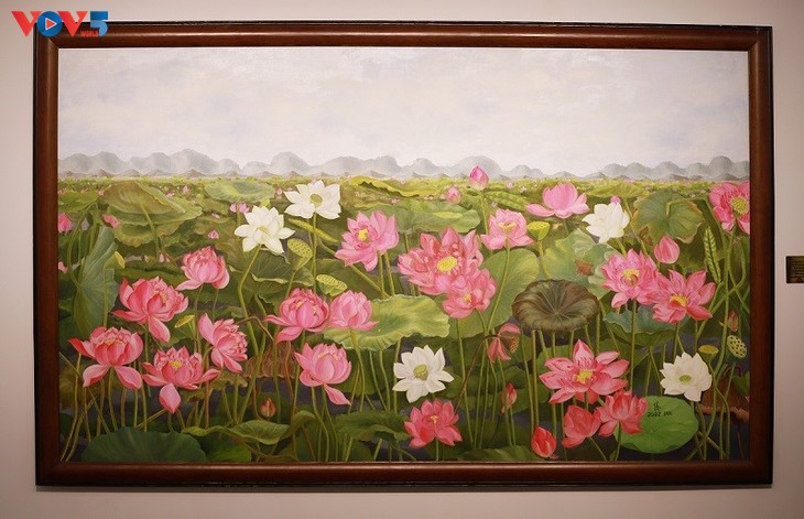画家金德的《莲花静景》在类似主题的多幅画中最为引人注目。画家让观者仿佛进入了“莲花的静境”,站在飘满花香的莲花潭边,唤醒观者所有的感官。越南佛教教会曾选择这幅画在2022年教会全国代表大会及佛教其他重大节日上展出。 |