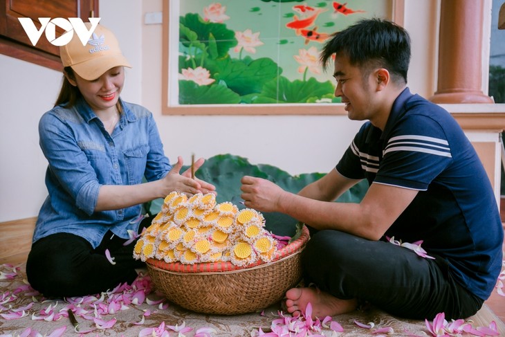 荷花茶窨制方法一般有两种。快窨的话,茶艺师就把茶叶直接塞进花里,用绳子绑住花瓣。花继续插在水中保鲜。几个小时后拿出来,切掉花茎,花朵进行减压包装,放进冰箱保管。这种茶按朵卖,每朵8万越盾(约合3.4美元),一朵能泡一壶茶。 |