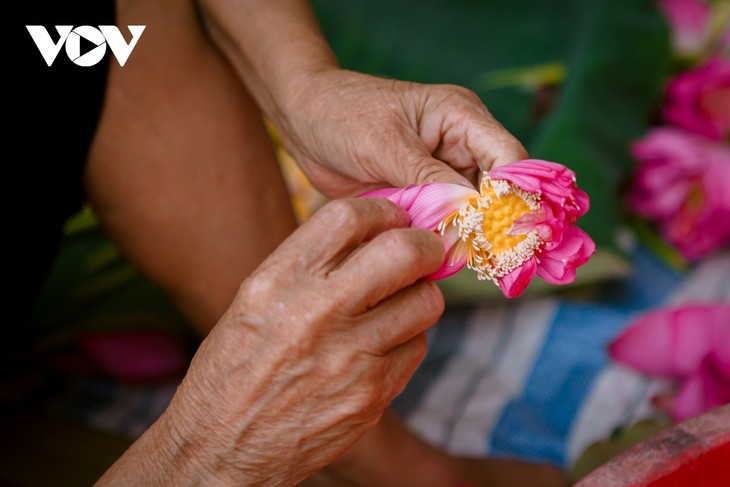 掐雄蕊是要求最严格的环节,茶艺师双手要灵巧、眼睛要敏捷,才能让雄蕊不烂,还留住荷花特有的香味。 |