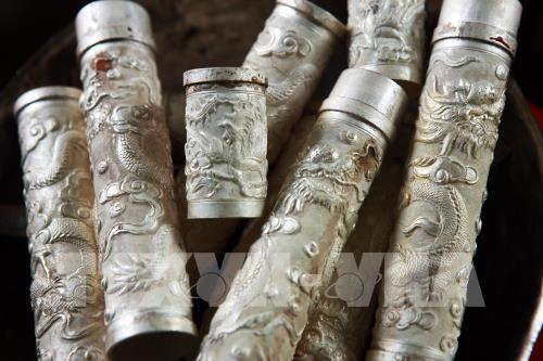 艺人黎清接着说:“金、银或铜,每种的制作都有其难度,但无论是哪一种,铜锓艺人都能做,并且能保障其艺术和技术。纪念升龙河内1000周年之际,铜锓银雕村制作了两件大型作品:端门和李公蕴皇帝迁都。我自己也做了‘独柱寺与莲花’这件作品,用作阮富仲总书记访问缅甸时的外交礼品”。