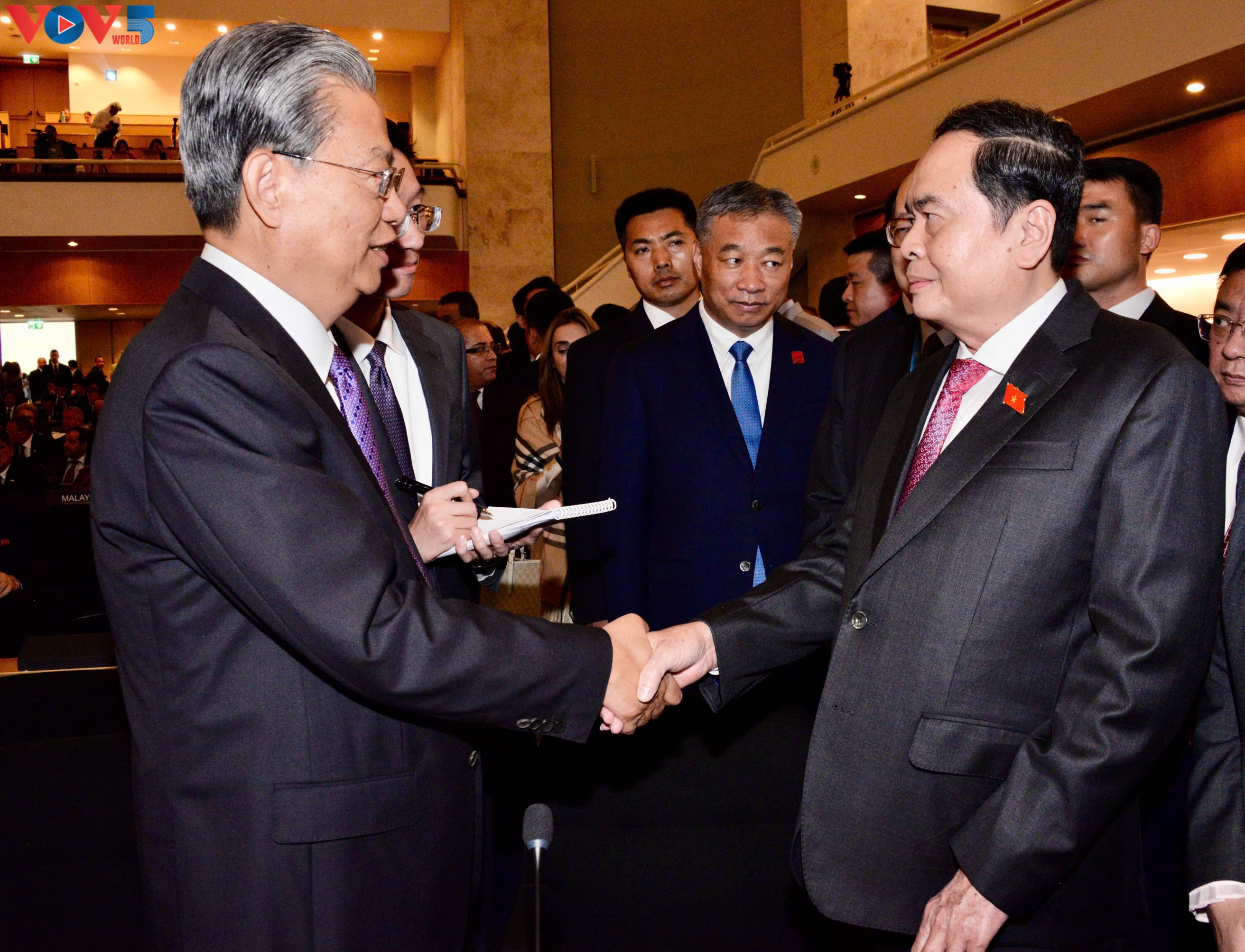 正在瑞士日内瓦出席第6届各国议会议长会议的越南国会主席陈青敏29日会见了中国全国人大常委会委员长赵乐际。