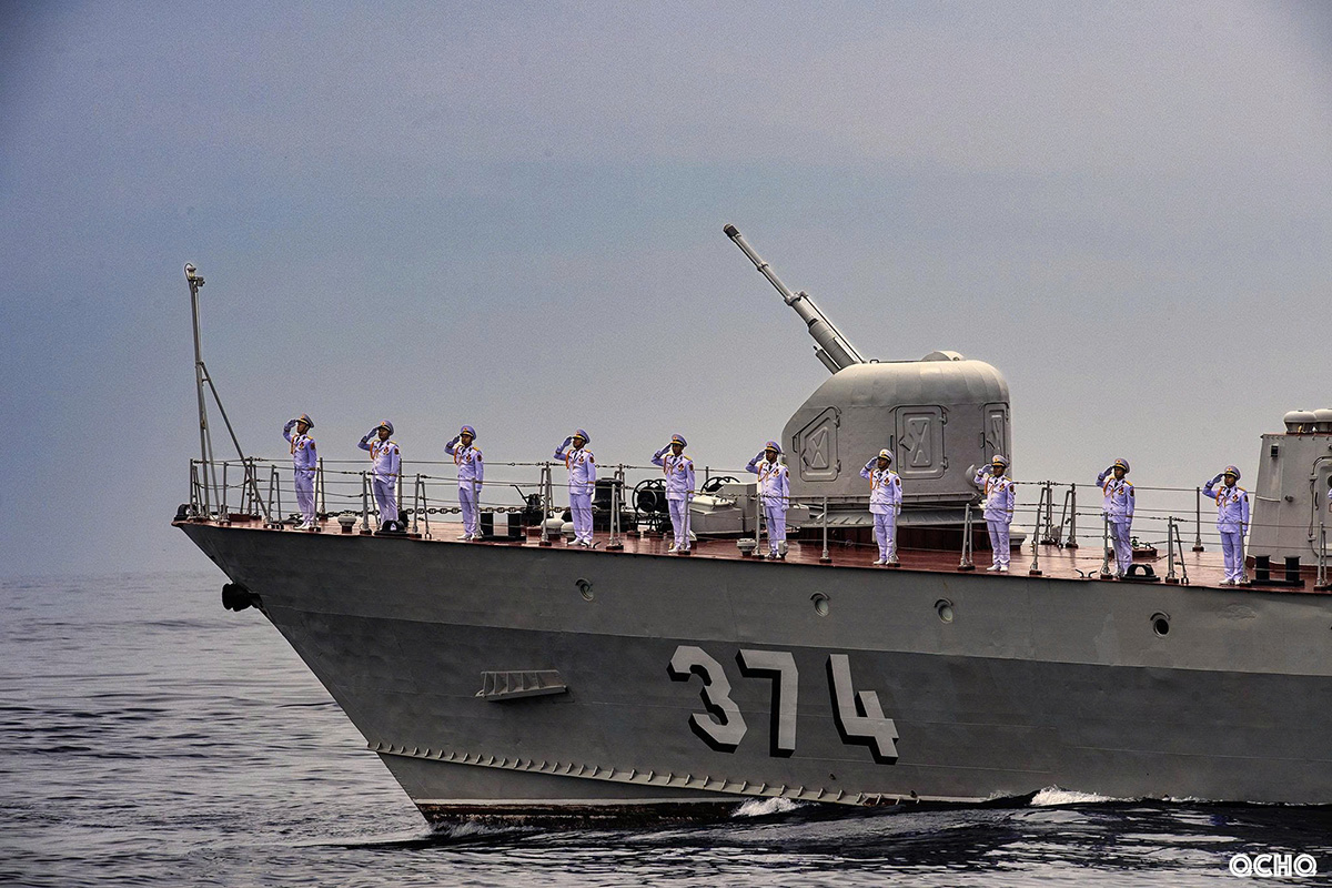 在巴亭广场举行升旗仪式的同时,受阅舰艇编队和飞机编队在海上向国旗敬礼。舰艇编队分两列列队行进,指挥舰015号舰在最前居中行驶。
