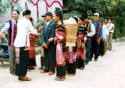 婚礼称得上是村里的节日,为期一天,一般在月圆那天举行。婚礼是下午在公房举行的。男方准备的聘礼包括:一只鸡和一罐竹竿酒。