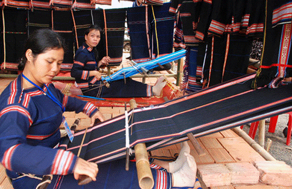 本以为嘉莱省达德瓦县格拉乡巴那族各户家庭的织机早已被遗忘,如今却又恢复了活动。十多年来,利用不需上坡地照看、收获咖啡、胡椒的闲暇时间,当地巴那族妇女围在一起纺纱织布。她们灵巧的双手编织出了巴那族传统服装、围巾或腰带上的每个花纹和细节。