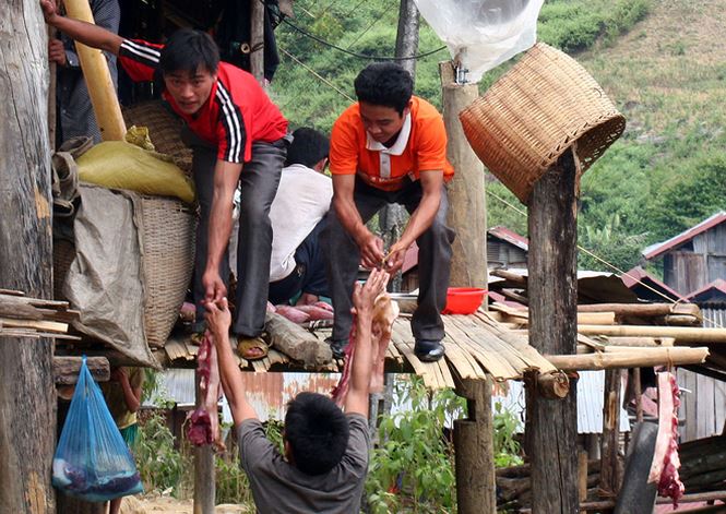 送亲团到男家后将分两头沿着男女单用的两座梯子上去。进家门后,婆婆将立刻把新娘带进屋里,到了吃饭的时候,新娘也一起下厨做饭和布置餐桌。
