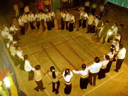 夫诺克山脚下嫩梭河流过的地方,悠扬的葫芦琴声在山间久久回荡。自古以来,只要有喜事,高朋满座,无论节庆与否,孟梭泰族姑娘都会穿上色彩斑斓的传统服装,手拉着手挑起摆手舞。