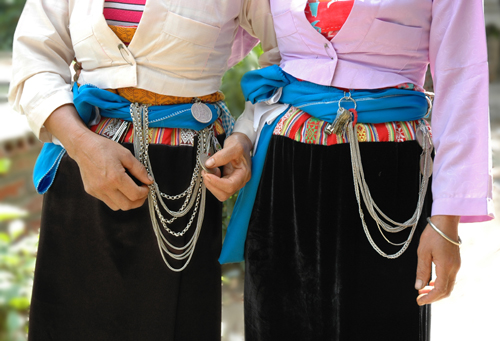 裙子正是芒族女性服装中夺人眼球之处。它不仅从腰部往下,还包括胸部。裙腰部分是芒族妇女最下功夫和极富创意的地方,起到妆点整套服装,使其更绚丽夺目的作用。特别是,裙腰都是用丝绸织成的纹饰,以及龙、鹿、橄榄形、方形等图案。