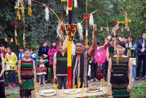 每年西原地区将迎来雨季(即农历3月底四月初)时,莫农族同胞都举行村门祭祀仪式。祭祀仪式前,村庄长老会召集所有村民通报仪式举行的时间,并指派村民准备供品。