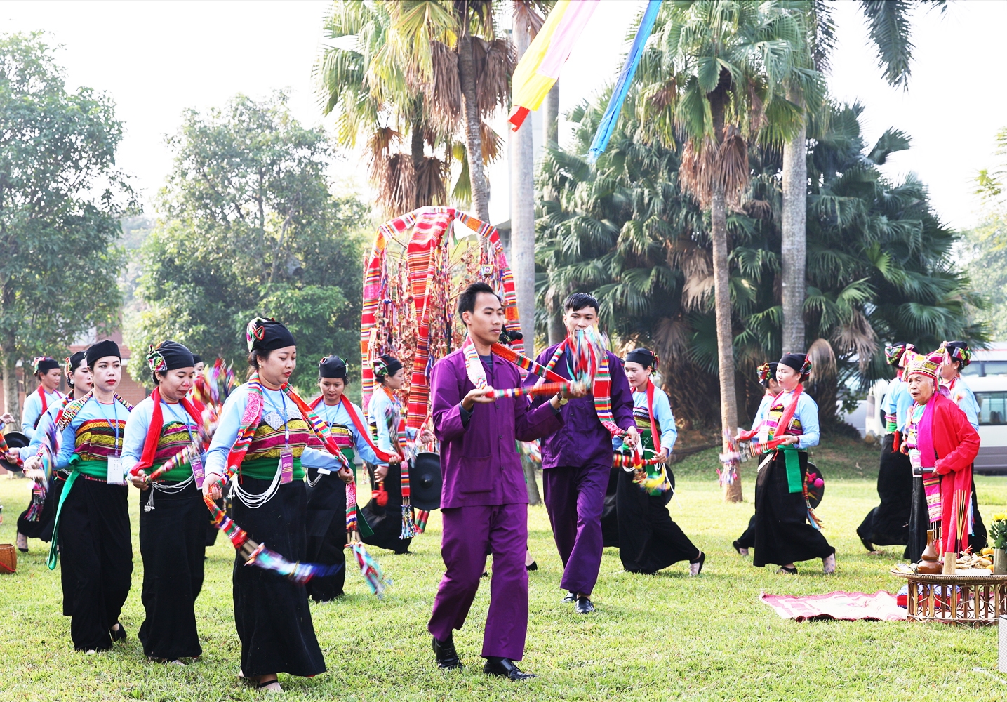 芒族人竖迎春竿仪式总是有全体同胞的共同参与。过去,当地同胞先集中在村长家竖迎春竿,然后再回到自家竖起迎春竿。如今,人们在文化活动中心竖起迎春竿,男女老少聚在一起,共享快乐时光。范氏宝补充道: