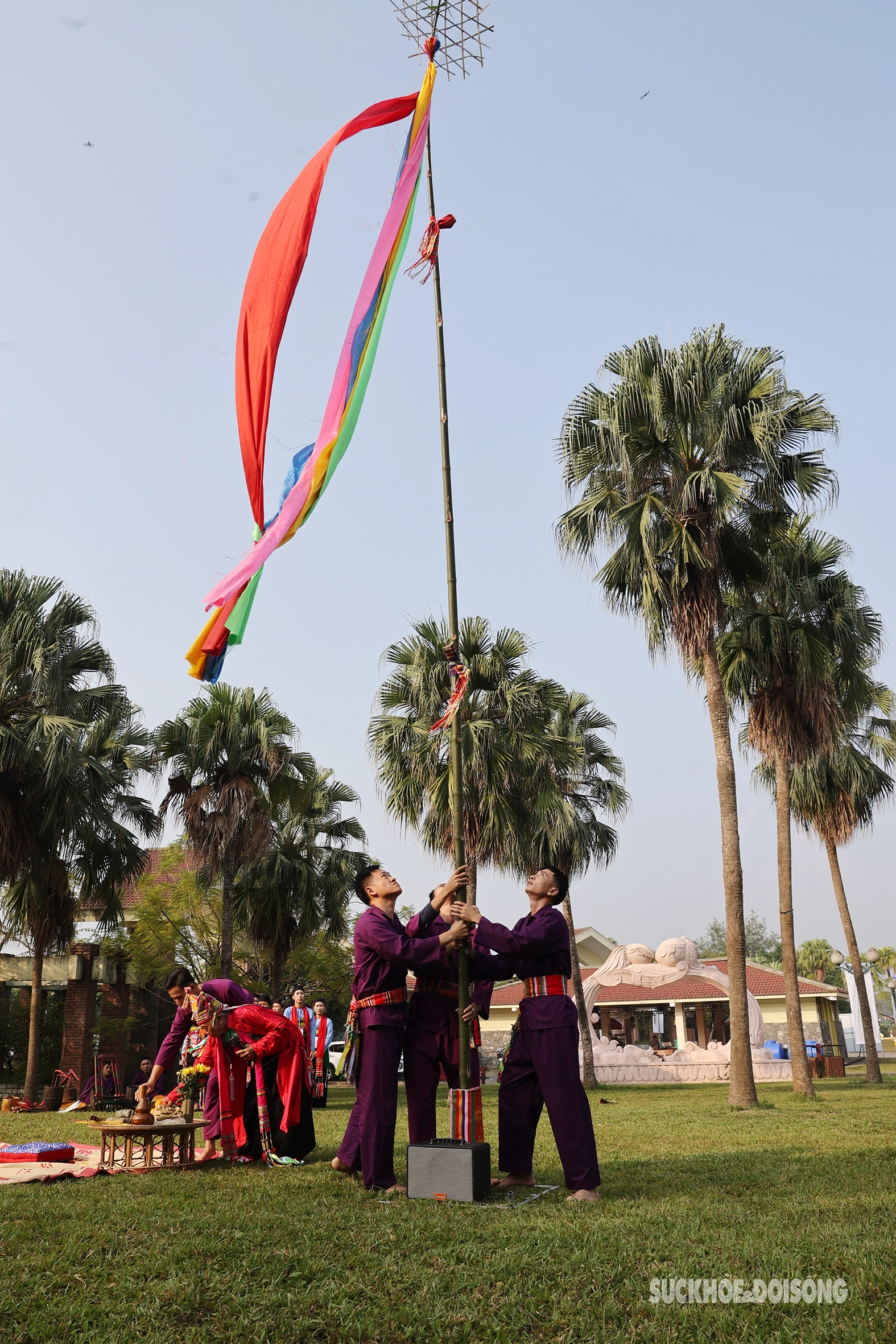 清化省文化电影中心工作人员裴文寿表示,在竖迎春竿仪式上,青年男女将一同为迎春竿洗澡,并邀请村里最德高望重的女性举行仪式: