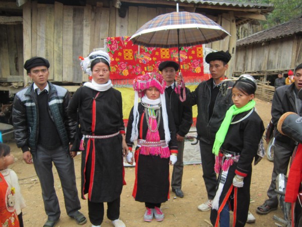 “男方家到女方家请求迎亲的人员包括一位媒公和两个小姑娘。所带的彩礼包括蚊帐被褥、一只鸡,还牵着一头水牛。男家带给女家的彩礼包括1.4公担猪肉、一担糯米、一担大米,供女家摆宴席,还有槟榔蒌叶,仅白酒就得60至80瓶。彩礼是用担子挑,不是用摩托车驮的。因为,以前生活困难,而且山泽族不是在平原,而是在山谷生活,所以只能挑担子,无法骑摩托车运过去。”