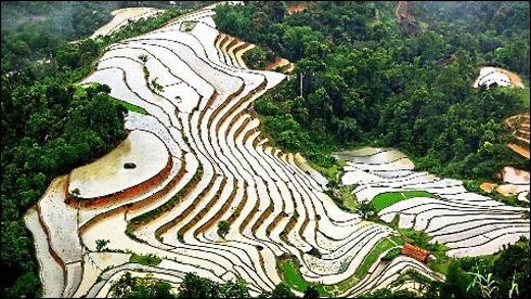 梯田是世界上许多民族在丘陵坡地上的一种耕作方式。因高山地区缺乏平地,所以少数民族同胞将在山坡上所选的土地 修筑成条状阶台式 断面的田地,并从高处向低处引水,这样就形成了可种植水稻的梯田。黄树皮是河江省高山地区边境县,是12个少数民族聚居的地方,也是 越南最美丽梯田的所在地。该县共有25个乡,也是岱依族(Tày),侬族(Nung),瑶族(Dao),赫蒙族(H'Mong)和其他一些民族居住的25个村庄。他们正是这些秀丽迷人的梯田的创造者。到目前为止,还无法确定是黄树皮的哪个民族创造了梯田及其耕作方式。然而,在拉志族——长期在黄树皮最高山区居住的民族的村庄里仍然流传着关于梯田的传说。