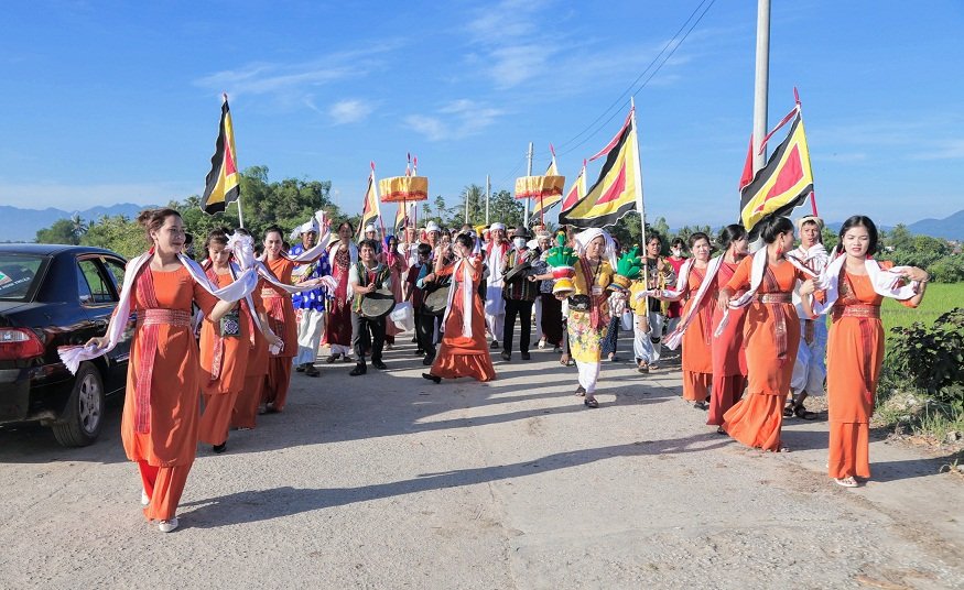 沐浴和穿衣仪式完成后,神像就穿上了华丽的龙袍。之后,占族人举行大典。大祭司也是感谢神灵仪式的主持人,献给诸神的祭品被摆放在祭坛前。仪式结束后是庆祝活动。此时,塔外开始热闹起来,占族传统歌曲和舞蹈与金昂鼓声、帕拉嫩鼓声、萨拉奈号角声融为一体。大家一起祈求神灵、祖先保佑风调雨顺,庄稼丰收,人丁健康兴旺,事业顺利,诸事如意。