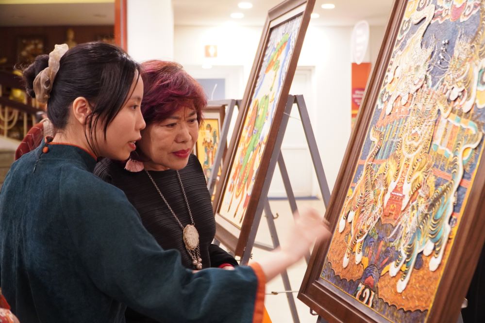 去年3月,锦画小组推出了采用画金沙技术改编和完善的鼓行画系的民间绘画《五虎神图》。锦画小组的 10 名成员本着尊重原作的构图到传统色彩精神花了 300 个小时完成了这幅画。画面威严、生动、引人注目,色彩鲜艳,灵活柔和的3D浮雕技术为画作创造了独特的艺术价值。锦画小组取得的成功离不开小组领导人阮黄英所做出的巨大贡献。