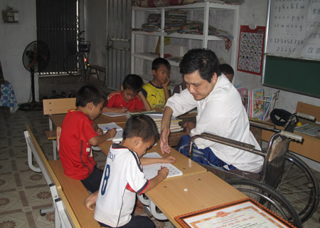 (VOVworld)- 有一位手脚肌萎缩症的不幸者,要靠轮椅行走,但他坚持锻炼,学会用牙齿写字,并成为当地许多孩子的老师。他就是河内章美县南方进乡仁李村村民冯文长。
