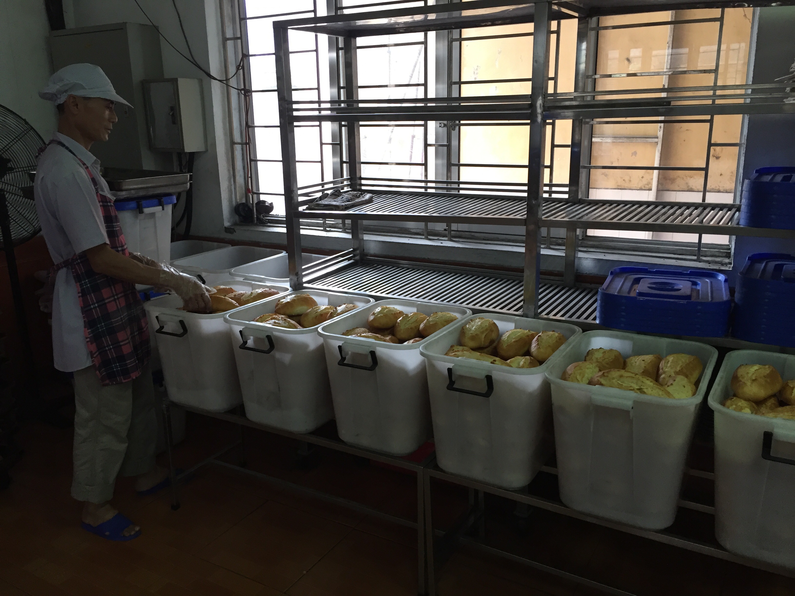 来到广宁省最大、历史最悠久的煤矿开采区之一的河林煤矿,我们跟随着矿工和矿区干部参观了面包厂。在这个黑黝黝的煤矿,面包厂显得很干净整齐。厂里弥漫着浓郁的面粉味和刚出炉的热腾腾的面包香。
