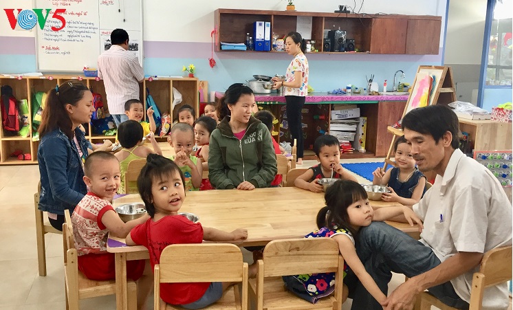 岘港天空幼儿教育照顾中心副主任陈氏清平称,该中心是由美国非营利组织成立的。这简直是一家社会保障中心,其目的是为和庆工业区贫困工人的子女营造一个达到国际标准的学习环境。主要教育方法是培养与发展孩子们的团队合作能力,提升他们的好奇心和观察力,发挥创新思维和潜能。陈氏清平表示,每天,老师们都写日志,记录孩子们的活动,让家长掌握孩子在学校的情况。
