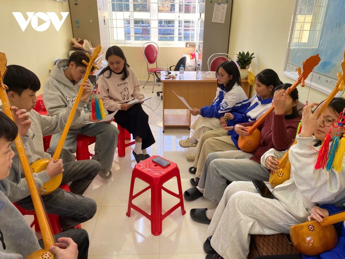 每天下午课后,在高平省石安高中的小教室里,学生们练习演唱滩伦民歌,弹丁琴,并反复练习岱依族语的歌词和发音。