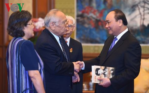 | 越南政府总理阮春福(右)手拿着关于阮山的书和阮山的中国儿子陈寒风握手 |