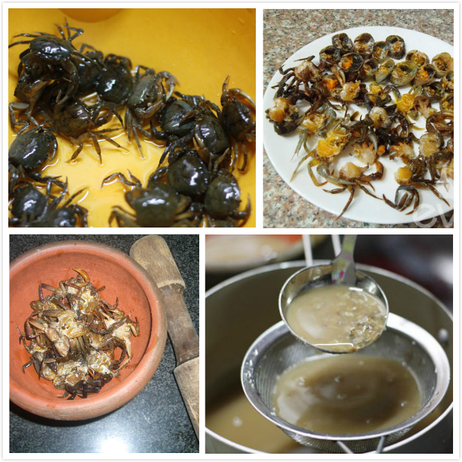 田蟹有了,做汤也十分讲究。把田蟹放进一盆净水里,浸30分钟,让田蟹吐泥。然后,用筷子用力搅拌,将田蟹洗干净。洗好后,把田蟹背上和肚子的壳剥去,取出中间的蟹肉洗净,除去臭味,然后放进臼里舂。这时要放点盐,让蟹肉味道更浓郁。如今,超市、商店里都有已经磨好的田蟹卖,但抽出一点时间,亲手做的汤还是最好吃的,此外,也能保持其传统味道。