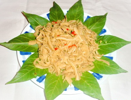 猪耳夏卷的做法比较简单,首先洗净猪耳朵,煮好后切片,加上一点干炒米粉和调料,然后用榕叶或卷皮包着就行了。虽然简单,但河内有些餐馆单做这个就做了数十年了,每天服务数千人次食客。